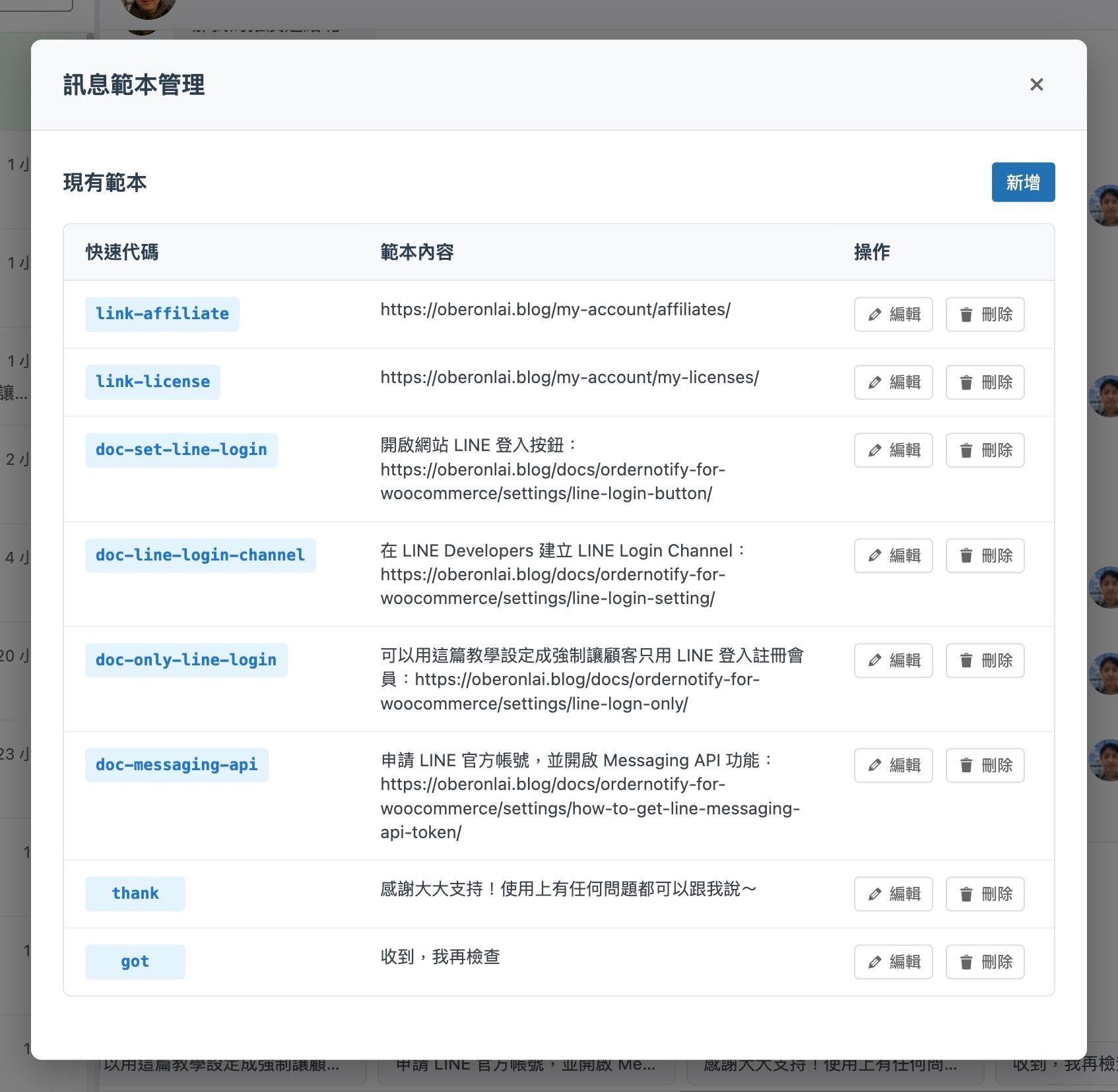 每次自己要找一些教學連結給客戶時,總時要開啟新分頁用 Google 搜尋自己的網站,找到連結後複製起來再貼給客戶,很麻煩又浪費時間,現在只要點選範本按鈕,就能把預設的文字存成範本,然後直接在訊息欄點選即可。