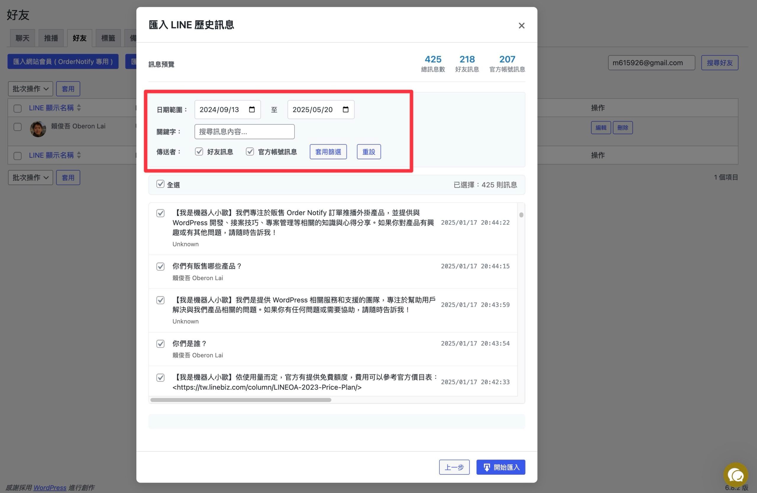 想要把重要客戶在 LINE 後台的對話紀錄匯入到 OrderChatz 嗎?現在只要從好友列表頁中點擊匯入訊息,就能把從 LINE 匯出的對話紀錄進行匯入,並且在匯入前還可以先篩選真正重要的訊息,避免一次匯入太多無用的資訊。